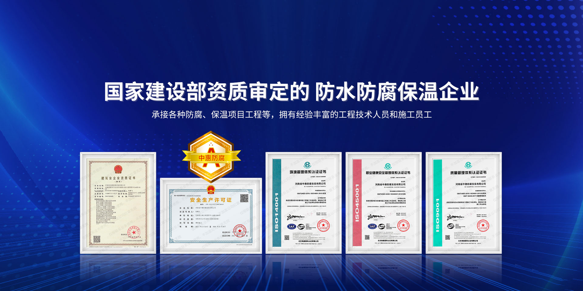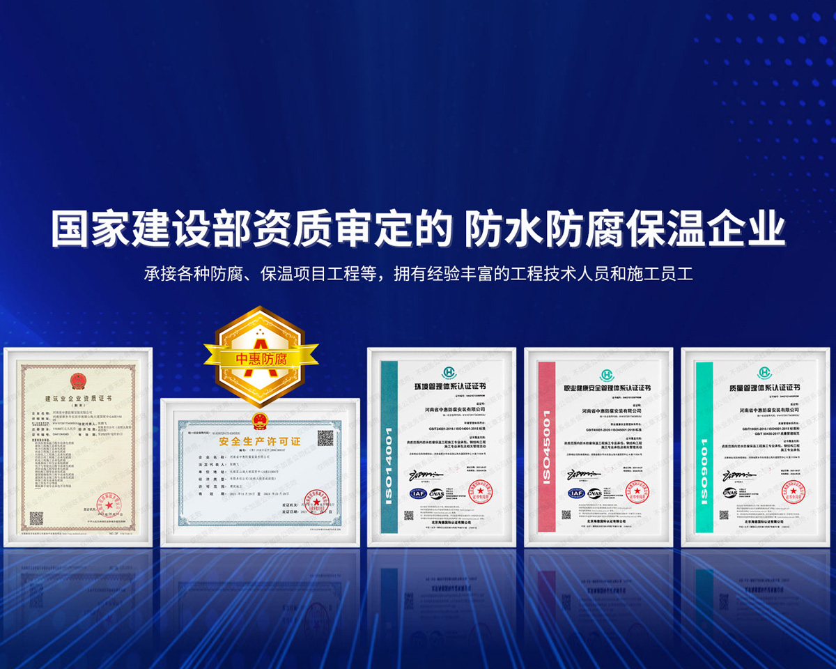 公司經營范圍:防水防腐保溫工程;消防設施工程;建筑裝修裝飾工程;建筑機電安裝工程;電力工程;建筑工程;石油化工工程;工業清洗工程;油罐清洗工程;鋼結構工程;環保工程;模板腳手架工程;電纜防火封堵、防污閃噴涂、外墻外保溫工程;各類施工勞務作業;設備維修、船舶鉚焊、涂裝;電力工程材料、建材、防水材料、防火材料、防腐保溫材料銷售,并相繼通過了GB/T19001-2008idtISO9001:2008GB/T50430-2007質量管理體系認證證書。GB/T24001-2004idtISO14001:2004環境管理體系認證證書。GB/T28001-2011idtOHSAS18001:2007職業健康安全管理體系認證證書。公司是中國防腐蝕于防護協會、中國施工企業管理協會、電力協會和中國鋼結構防水協會會員單位。 公司的經營業務涵蓋了石油、化工、電力、冶金、煤炭、船舶、國防、燃氣、水利、環保、交通運輸、航空及國防軍工和輕紡市政等行業的防腐保溫絕熱設備。鋼結構安裝、防火、防水、金屬噴鍍、聚脲噴繪、陰極保護、防滲透堵漏、玻璃鋼及各種磚版材料襯里、橡膠襯里、煙氣硫和耐酸溶劑腐蝕等工程施工。公司連續十年榮獲“省市先進施工企業”“安全生產先進單位”“重合同,守信用企業”和“AA***資質企業”的稱號。2000年被命名為市級文明單位,2002年被國家工商行政管理局命名為“重合同,守信用的企業”、被中國工業防腐蝕技術協會命名為“防腐蝕企業,能源節約及環境保護領域有豐富的經驗和***的業績。工程一次交驗合格率100%。其中攀枝花鋼鐵公司煉鐵廠四號高爐及熱風爐防腐工程、上海寶鋼公司煤氣柜防腐工程、撫順石油一廠裝置防腐項目、齊魯石化公司稀烴廠高塔防腐工程、吉林化學工業公司煉油廠油罐防腐工程、天津石化熱電廠六號爐頂棚聯絡管保溫工程、大慶油田(太倉)力神泵業工程、中國化學工程第十一建設工程、中原油田勘探局工程、中國石化銷售有限公司華北分部、魯皖輸油管道工程、貴州開磷息烽合成氨工程、陜西黃陵煤化工程、中國石油天然氣西部管道塔里木輸油工程、邯鋼集團邯寶鋼鐵公司煉鐵工程、德州供電工程、吉寶(南通)船廠工程,偃師華潤熱力工程、鄭州熱力總公司。 河南省中惠防腐安裝有限公司愿以豐富的施工經驗,***的技術,***的設備,***的管理,***的服務,竭誠為國內外廣大的用戶提供***滿意、******的工程作品。 我公司愿與國內外同仁一道,團結協作,共同推進防腐蝕行業發展! 公司地址:河南省長垣縣建設路北段360號 固定電話:0373-8866488 郵編:453400 網址:http://www_zhff_com_cn.xdexin.com